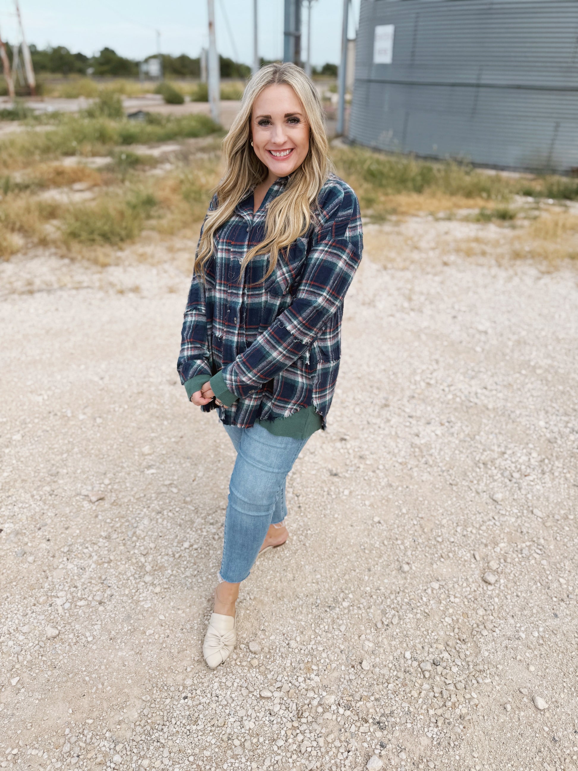 This plaid shirt with frayed details has beautiful fall colors, chest pockets, long sleeves and button-clasped cuffs.The green waffle fabric cuffs and bottom layer are the cutest contrast! It also has regular pockets! A perfect layering piece for cooler weather.