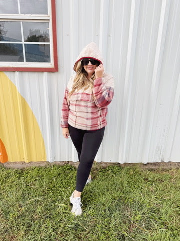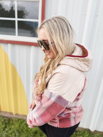 Pick Up - Tried & True Oatmeal & Garnet Plaid Half Zip Puffer Hoodie